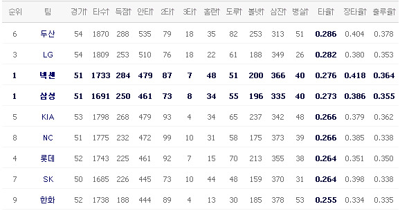 32승 1무 18패 (1위)  :  26승 2무 24패 (4위)