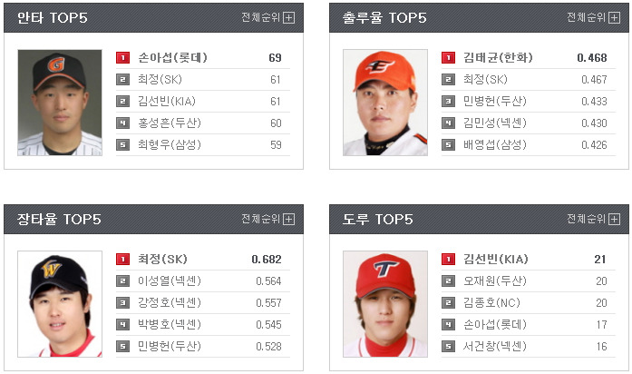 5. 박정권 (1 루)      5. 윤석민 (3 루)