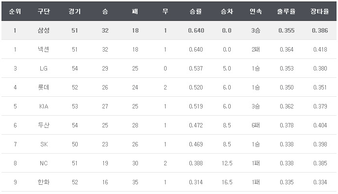 29승 0무 25패 (3위)  :  16승 1무 35패 (9위)