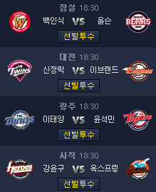 [L G 1 (6회초) 0 한화] [N C 2 (5회말) 5 KIA] [넥센 1 (5회말) 3 롯데]