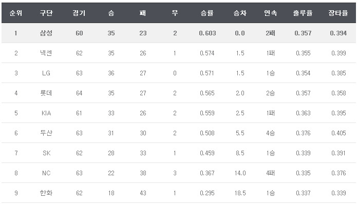 35승 1무 26패 (2위)  :  18승 1무 43패 (9위)