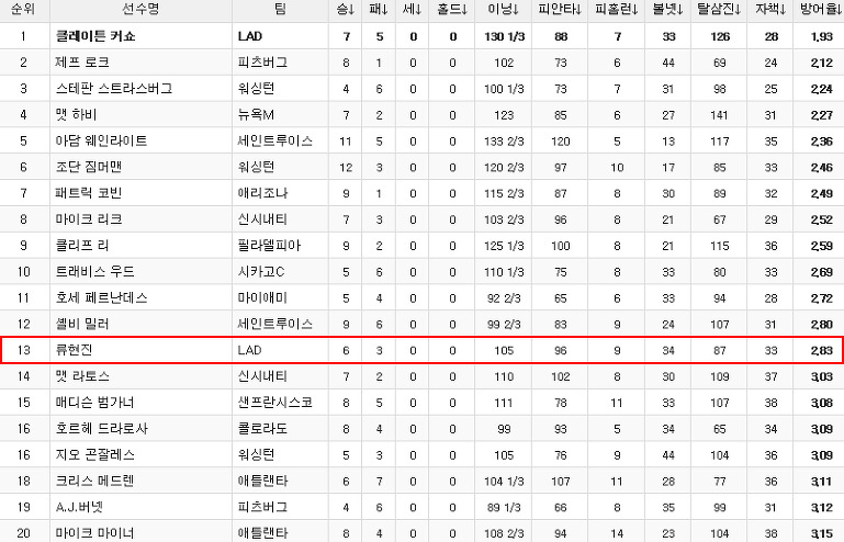타 사이트에서 본 글에 의하면 5월에 류현진과 매치에서 첫승을 거둔 후 귀신같이 올라가고 있다고 하네요...최근 5경기는 거의 커쇼급입니다.