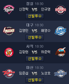 롯데(김사율) vs sk(세든) (!!!!!!!!!!!!!!!!!) 엘지(신재웅) vs 두산(헨킨스) 기아(서재응) vs nc(이태양) 넥센(밴헤켄) vs 삼성(밴덴헐크)