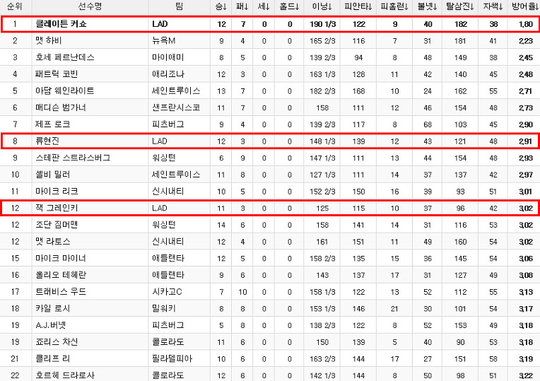와..커쇼 정말 이닝소화랑 방어율이 장난 아니네요...