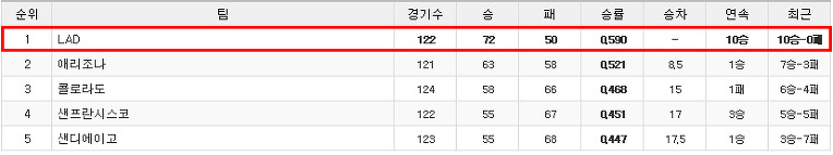 NL 서부 1위 (72승 50패)                                                                       NL 동부 4위 (53승 69패)