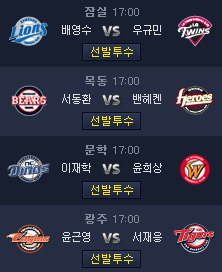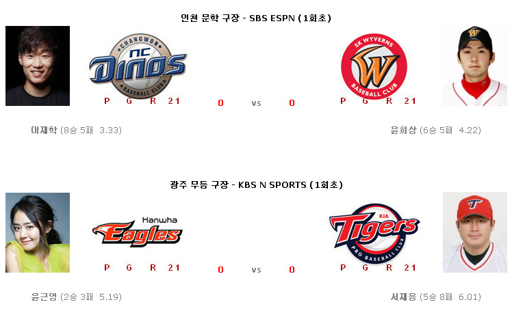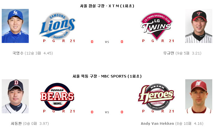 [두산 0 (3회초) 2 넥센] [N C 0 (3회말) 0 S K] [한화 6 (2회말) 2 KIA]