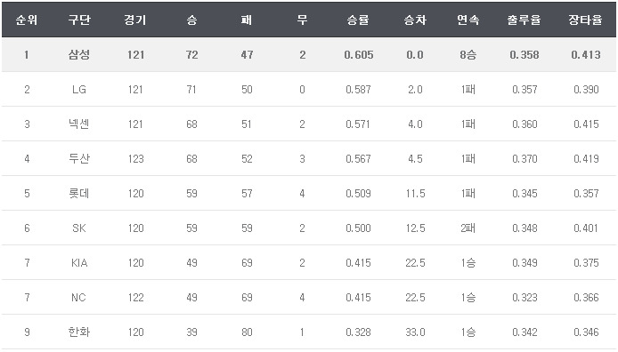 삼성은 오늘마저 이겼으면, 2위와 2.5게임차로 한 숨 돌릴만한 승차였을텐데, 져버리는 바람에 숨돌릴 틈이 적은 1.5게임차가 되었네요. 엘지 트윈스가 하는 토일월 넥삼두 전이 우주에서 제일 중요한 3연전이 될거 같습니다 만 일월에는 정지훈 선발 투수가 등판이 예정되어있습니다. ;; 비가 한 번오면 10월 4일로 미루면 되지만, 두 번 내리면 10월 5일에 모든 경기를 끝내고자 한 크보의 일정에 큰 차질이 생기겠네요. 크크 아무튼 올해 프로야구는 끝까지 쫄깃합니다.