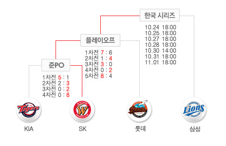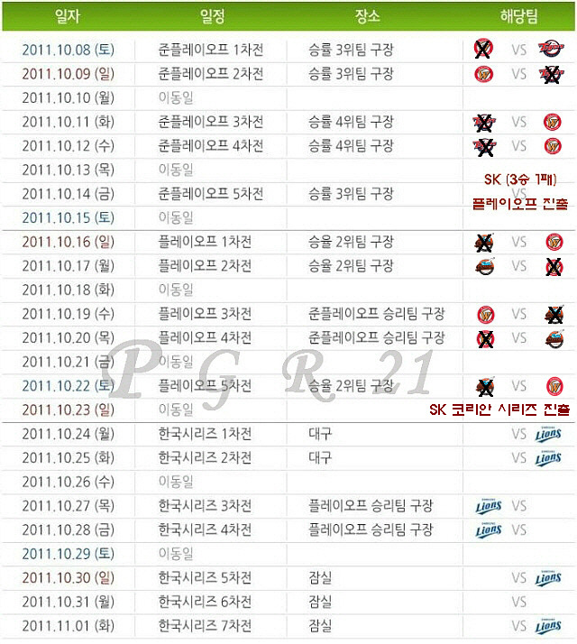 SK가 5년 연속 코리안 시리즈 진출에 성공합니다.. SK 팬 분들 축하드립니다.. 그리고 롯데 팬 분들 수고 많으셨습니다.. 롯데는 2011년 최고의 팀이었습니다.. 코시 때 뵙겠습니다..