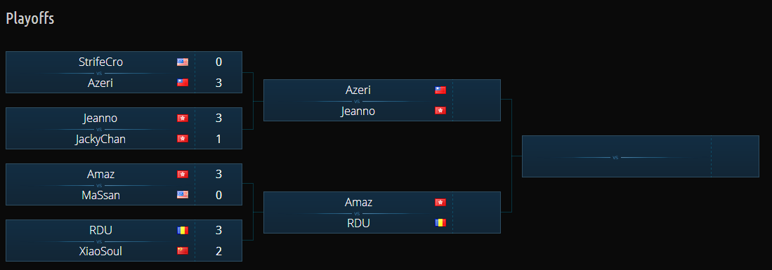 반대편에는 유명한 미국선수 StrifeCro를 꺾고 올라온 대만의 Azeri 선수와 같은 홍콩선수인 Jackychan를 꺾고 올라온 Jeanno 선수가 붙습니다.