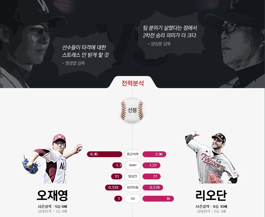 염감독이 LG의 홈팬들의 열기를 의식하는 발언을 했는데...(실제로 준플레이오프 NC랑의 경기 4차전 직관갔는데 3루 블루,레드 응원단상빼고 다 LG 팬들이 장악했더라고요) 오늘은 넥센팬분들이 얼마나 와주셨을지.