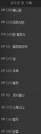 k'님 본문에 아스날이랑 스완지 로고를 바꿔주셔야 할 것 같아요 아래 포메이션하고 등번호보면 오른쪽이 아스날이네요 26번이 누군가 한참 찾았네요 흐흐