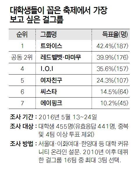 그와는 별개로 ioi랑 트와이스가 대단한것 같긴 하더군요. 대학 축제는 싸이/IOI/재입학 정도만 보러다니는 사람이 무척 많습니다
