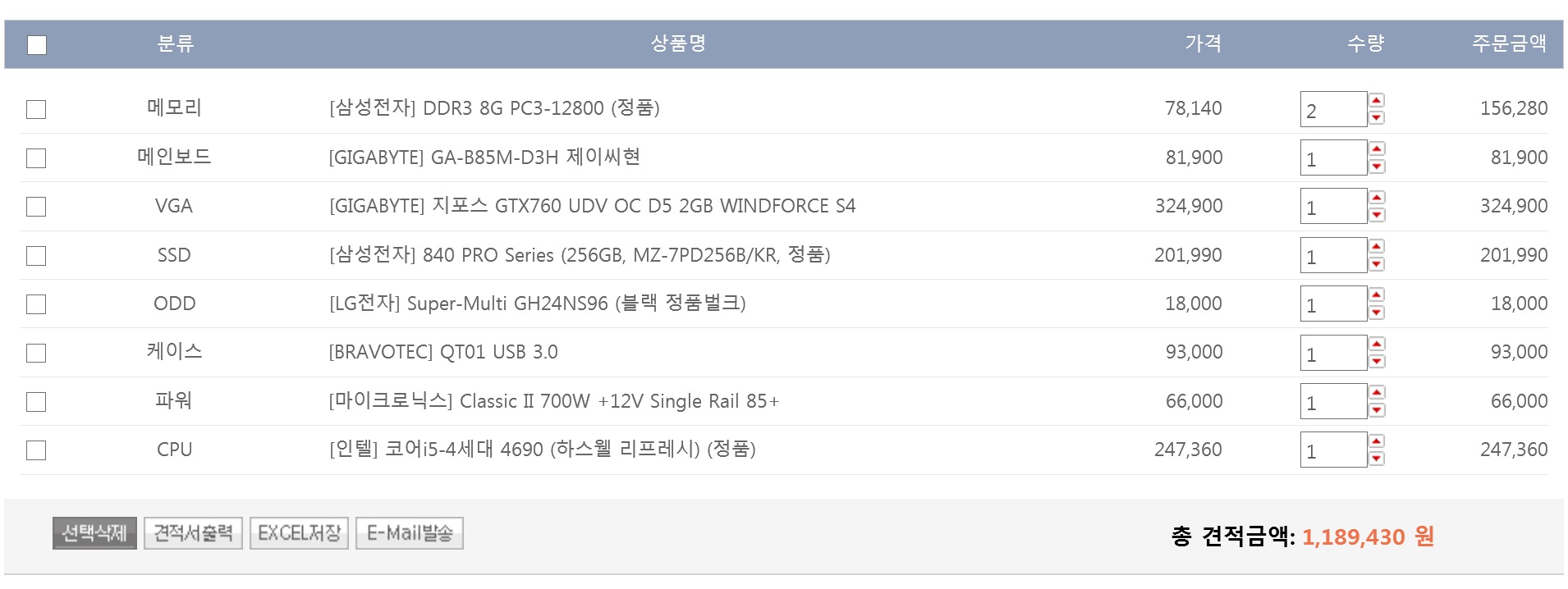 삼성전자 DDR3 8G PC3-12800 (정품) x 2 147,000 ASRock B85M PRO4 디앤디컴 64,600 GIGABYTE 지포스 GTX760 UDV OC D5 2GB WINDFORCE S4 291,800 삼성전자 840 PRO Series (256GB, MZ-7PD256B/KR, 정품) 183,800 LG전자 Super-Multi GH24NS96 (블랙 정품벌크) 19,000 BRAVOTEC QT01 USB 3.0 84,300 시소닉 S12II-520 80PLUS 브론즈 79,600 총계 1,132,100 원 (www.itcube.co.kr) 현금가라 카드 계산하시면 5% 정도 더 붙을 겁니다. 그래픽작업을 하셔서 8쓰레드 중에 가성비 좋은걸로 CPU 변경하였습니다. 보드도 역시 가성비 좋은걸로.. 램 / VGA / SSD / ODD 는 그대로 두었습니다. 케이스는 취향이라 두었습니다. (나쁘다는 의미가 아닙니다) 파워는 개인적으로 몇 번 데여 봐서 저가형 PC 아니면 웬만하면 유명 브랜드 파워로 추천하는 편입니다. 견적의 10% 까지는 파워에 투자하는 것이 개인적으로 기준이고, 안정성에 정평이 난 시소닉으로 바꿨습니다. (하드웨어 포럼에서 각 브랜드 별로 파워 검색하면 시소닉이 불량 호소글이 압도적으로 적습니다) 파워 용량도 VGA 한 장이면 고성능 VGA 오버클럭 하지 않는 이상 500W 의 반도 못 씁니다.